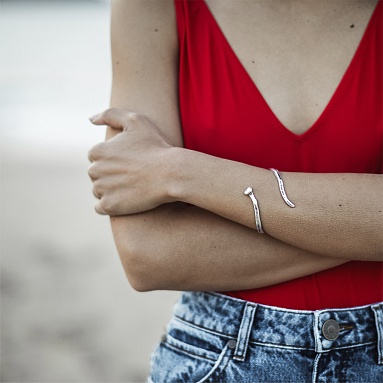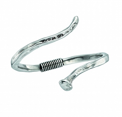Легендарный браслет бренда UNOde50. Жесткий незамкнутый браслет из посеребренного металла в форме гвоздя, согнутого в спираль. Браслет открывается и закрывается с помощью пружины, расположенной в центре. Дерзкое и смелое украшение идеально повторяет форму запястья. Уникальный стиль изделия выражает новаторский дух бренда UNOde50. Произведено в Испании, полностью ручная работа.