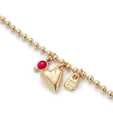 Продемонстрируйте страстность своей натуры с помощью браслета с красным кристаллом, с золотом, арт. PUL2559ROJORO0M из коллекции SER UNICO. Состоящий из металлических бусин аксессуар украшают три шарма: ассиметрично закрепленное сердечко, ярко-красный кристалл, заключенный в оправу, и легендарный замочек с фирменной надписью UNOde50. Креативный авторский дизайн, уникальный сплав ZAMAK, ручная работа — все это превращает аксессуар в стильное украшение, которое станет впечатляющим акцентом в вашем образе.