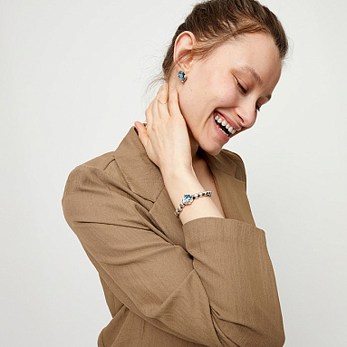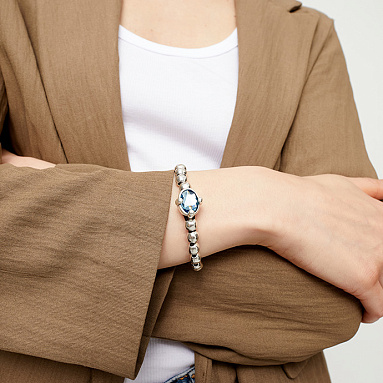 Браслет Ser Deslumbrante с голубым кристаллом словно впитал в себя свежесть морских волн и чистоту небесного света. Украшение деликатно обвивает запястье, а посеребренные элементы переливаются таинственным сиянием, отражая волшебные искры. Главный акцент — голубой кристалл, мерцающий оттенками небесного и морского синего, будто заключивший в себе силу водной стихии и магию рассветного неба.