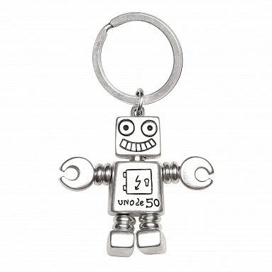 Посеребренный брелок с украшением в виде робота. Имеет выгравированный логотип UNO de 50.