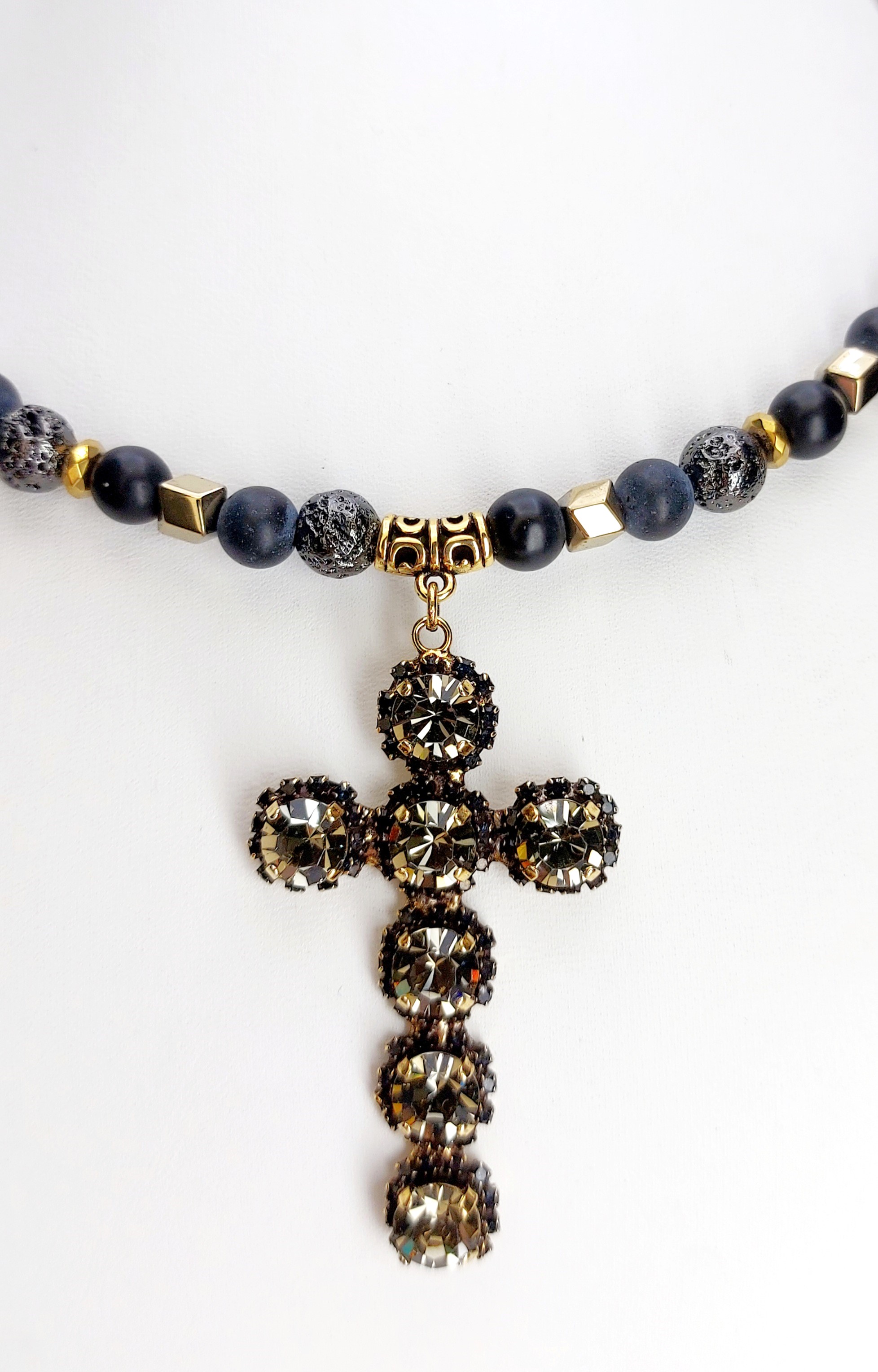 Чокер, вулканическая лава, гематит, кристалл swarovski, оникс