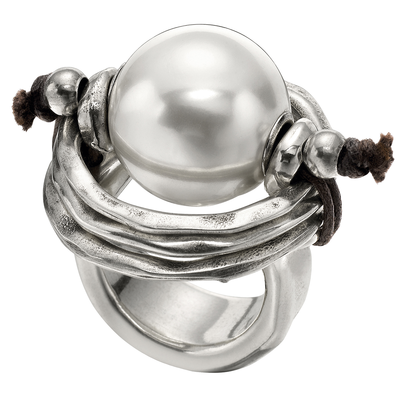 Металлическое кольцо с серебряным покрытием и большой жемчужиной посередине, закрепленной с помощью шнурочка из кожи. Выполнен в уникальном, ни с чем не сравнимом стиле UNOde50. 100% ручная работа, сделано в Испании.