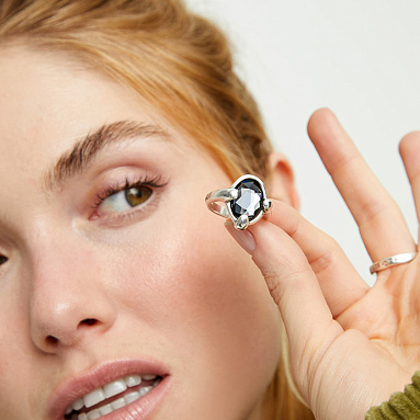 Посеребренная оправа тонко обрамляет камень, будто охраняя его от посторонних взглядов. Металл играет мягким холодным блеском, а плавные линии создают ощущение артефакта, снятого с руки могущественного мага или королевы ночи.