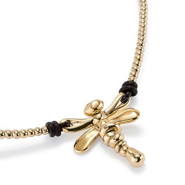 Короткое ожерелье со стрекозой в центре, с золотом, арт. COL1960ORO0000U из коллекции SER REBELDE — стильное украшение ручной работы, наделенное символическим смыслом, олицетворяющим легкость и скорость. Аксессуар, изготовленный из позолоченного сплава ZAMAK, представляет собой цепочку из металлических бусин с центральным элементом в виде впечатляющей стрекозы, которая словно оживает благодаря особенным свойства металла, создающего текучие линии, неровности, несовершенства, свойственные природе. Кожаные детали добавляют контраста, увеличивая визуальную привлекательность. Изделие имеет застежку-карабин и удлинительную цепочку, с помощью которой можно отрегулировать посадку наилучшим образом и выглядеть на все сто, куда бы вы ни пошли.
