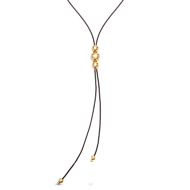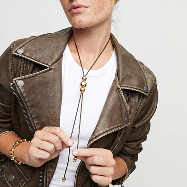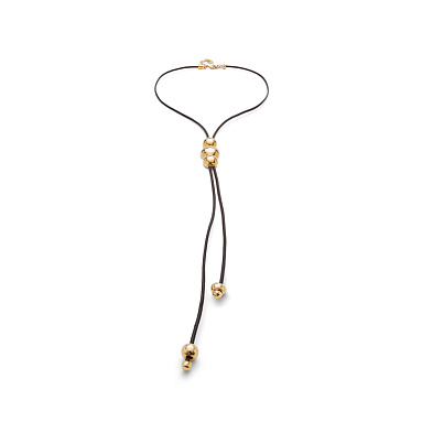 Изысканное кожаное ожерелье Ser Intrepida с золотом, арт. COL1998MARORO0U — выбор творческих натур, стремящихся проявить свою индивидуальность. Основой аксессуара являются два длинных шнурка из кожи, которые обвивают шею, благодаря соединению с помощью крупных металлических сфер разного диаметра. Спускающиеся вниз концы шнурков украшены дополнительными элементами. Соединение черной кожи и позолоченного сплава ZAMAK создает впечатляющий контраст. Изящное стильное украшение ручной работы с авторским дизайном станет достойным дополнением вечернего наряда. При этом благодаря своей лаконичности колье может служить выразительным акцентом и в повседневном образе.