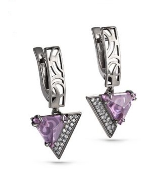 Просто чудесно выглядят эти серебряные серьги с ситаллом цвета фиалки! За счёт небольшого чернения серебра и искрящихся на свету фианитов камень приобретает ещё больший шарм. Невозможно отвести взгляд!