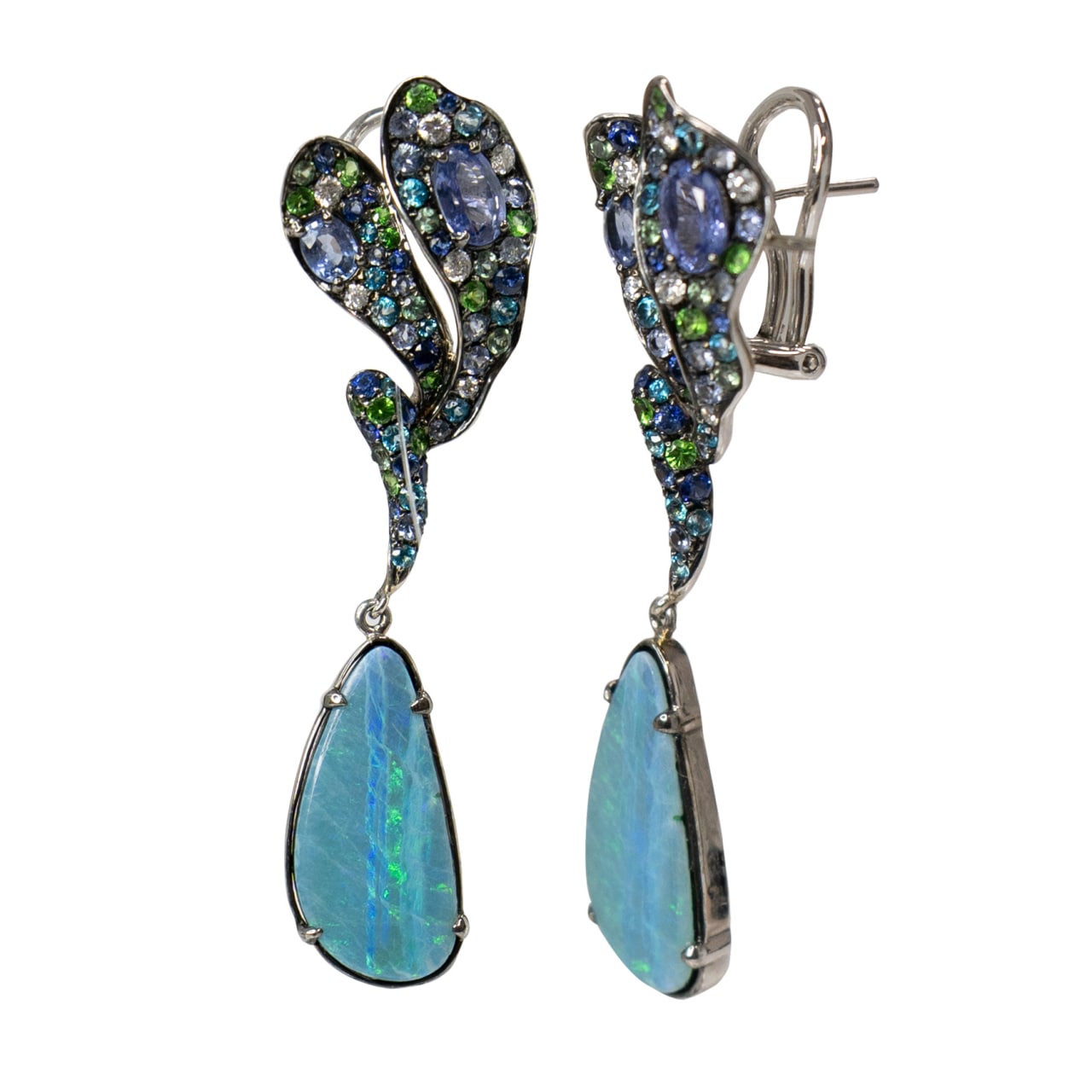 Серьги белое золото 585 пробы. Вставки Бриллиант Кр 57А, 12 шт. Сапфир природный 55 шт.Топаз 55 шт., Опал 2 шт. С помощью этих красивых сережек можно подчеркнуть изящность шеи, оттенить цвет глаз ...