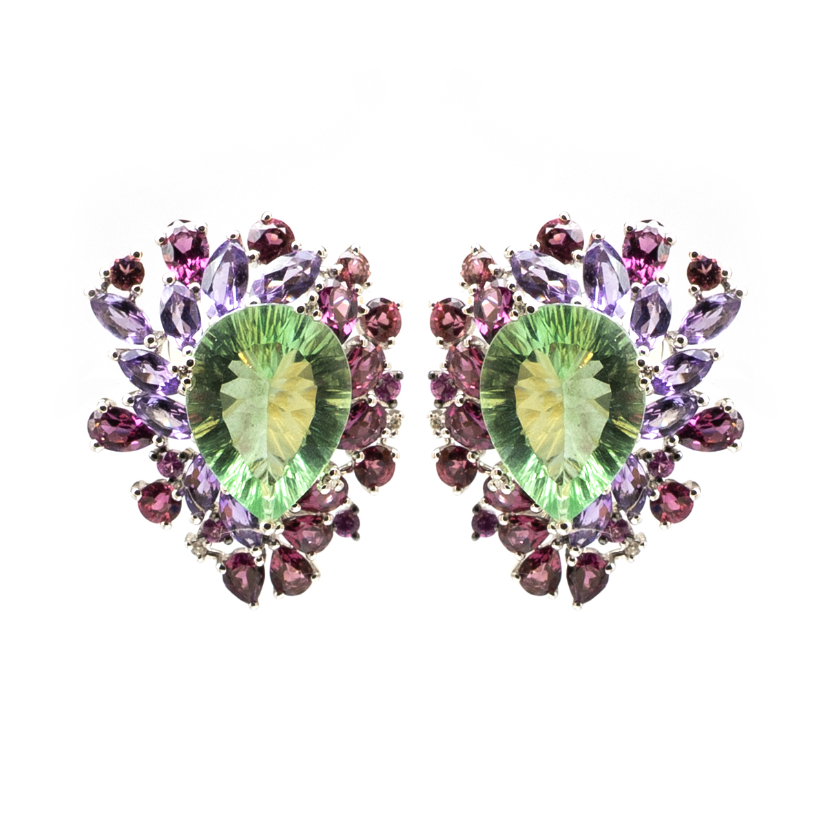 Серьги, аметист, бриллиант, родолит, сапфир розовый, флюорит